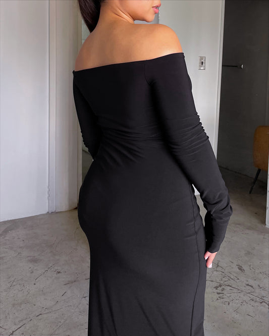S | Black Smooth Off-shoulder Sculpted Dress