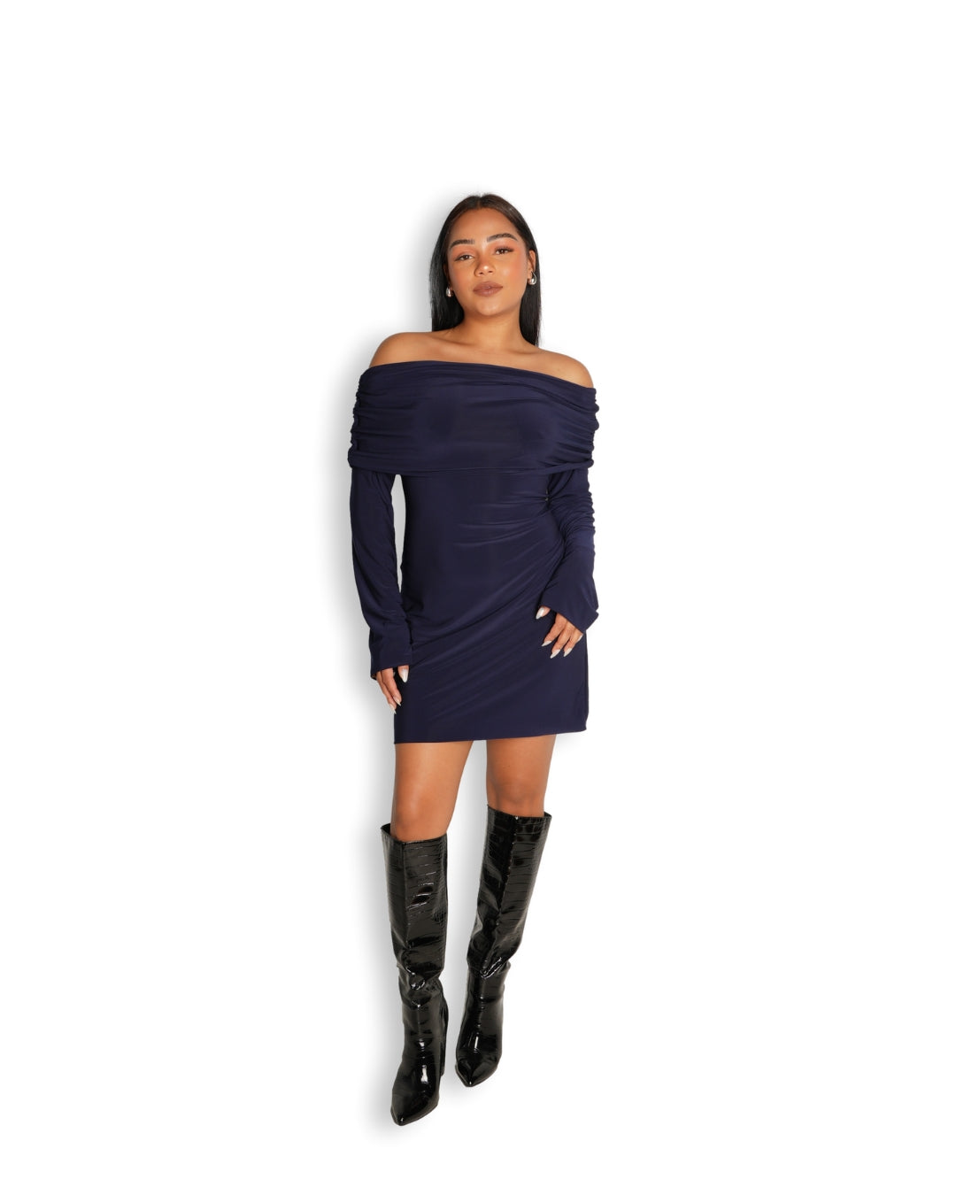 This double-lined dress features a ruched off-shoulder neckline, long sleeves and a buttery soft & stretchy fabric. Its approximate length is 83cm from the shoulder and it ends in a slight A-line silhouette. The model is wearing size medium and is 160cm tall.
