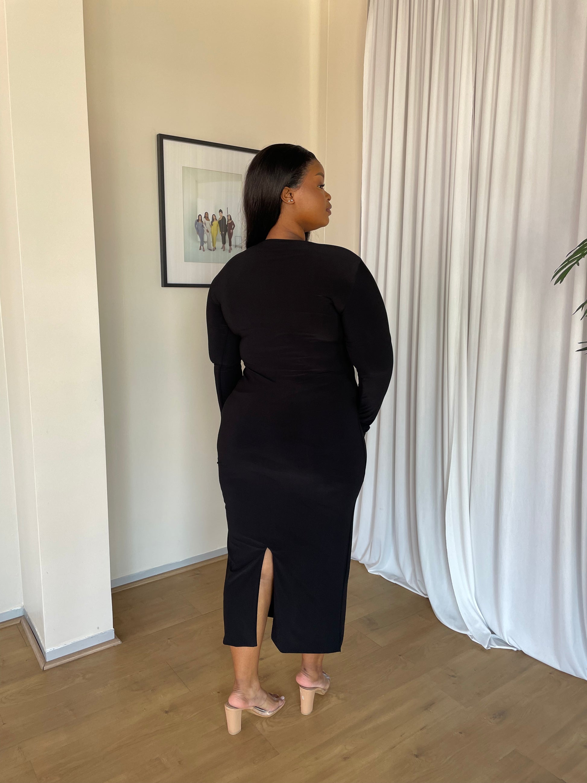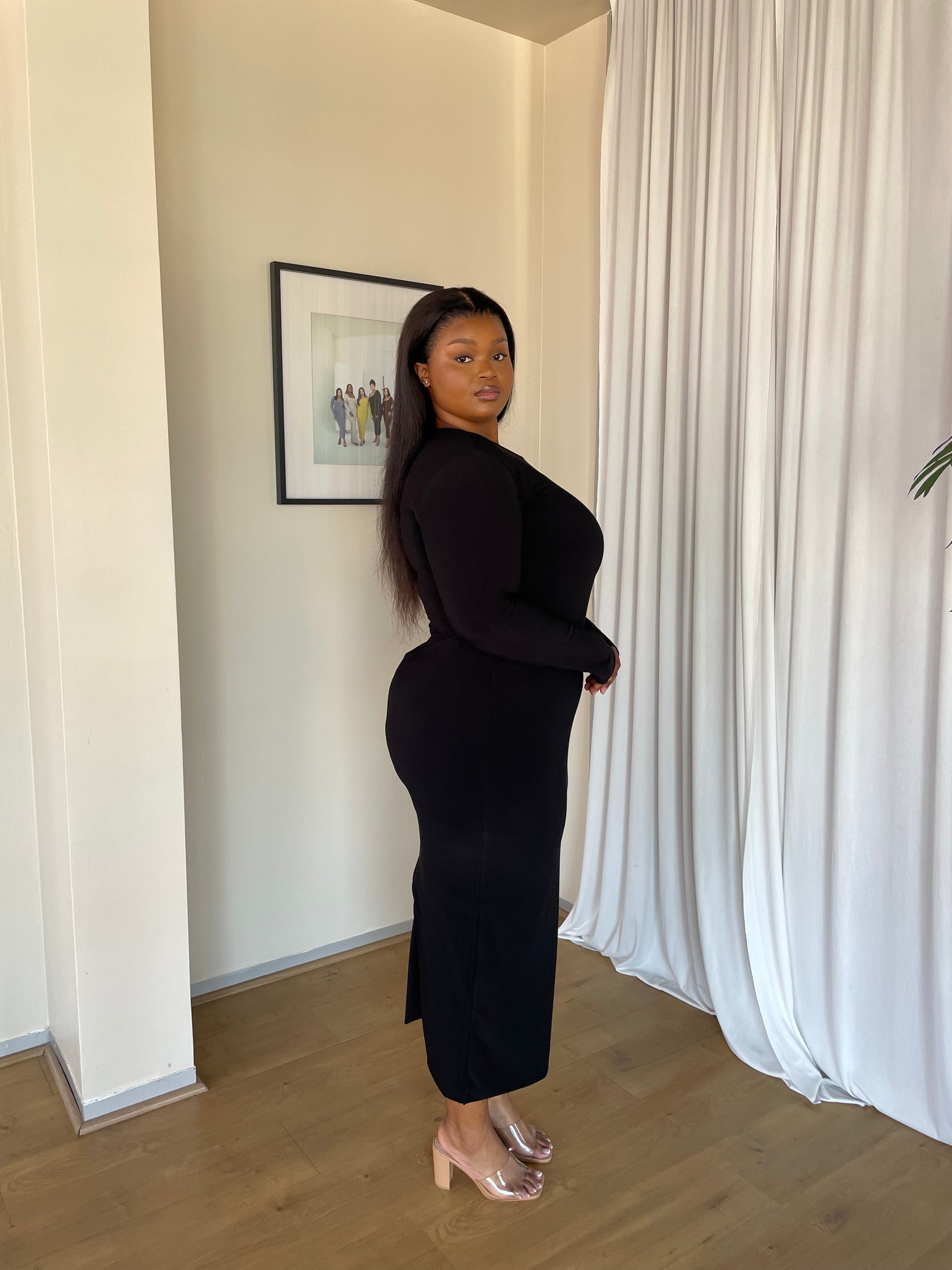 XL | Black Crew-Neck Sculpted Dress with Long Sleeves