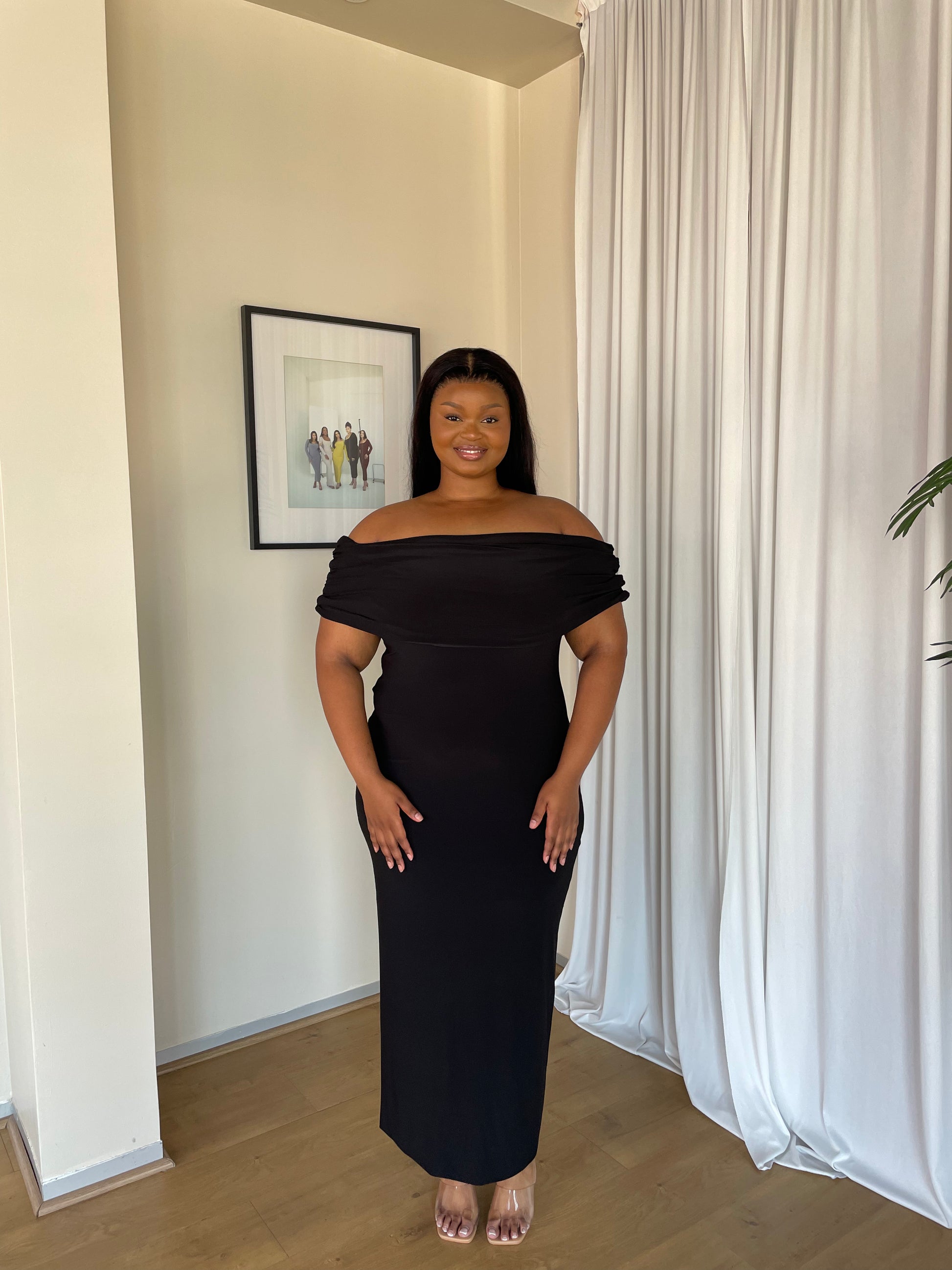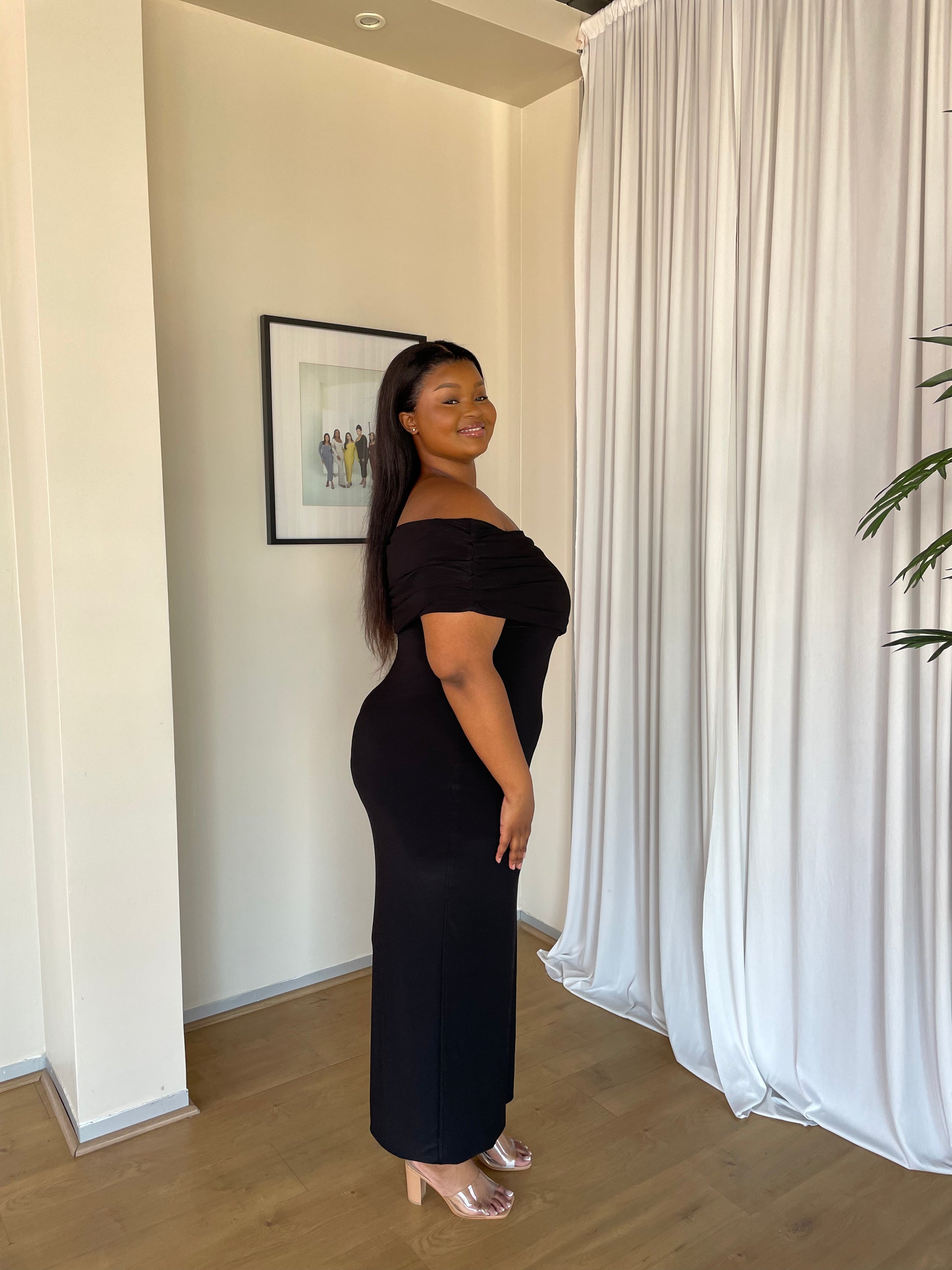 Crafted from signature buttery-soft and stretchy fabric, this double-lined dress features a stylishly ruched bardot neckline. Its length is 145cm from shoulder, but a customized length can be arranged by contacting us through email or Whatsapp. The model wears a size small (155cm in height) but one could size down for a more sculpted fit, as the dress is tapered towards the hem with a 45cm slit at the back. Low-maintenance and durable, this dress is perfect for special occasions such as matric dances or bridesmaids' dresses.